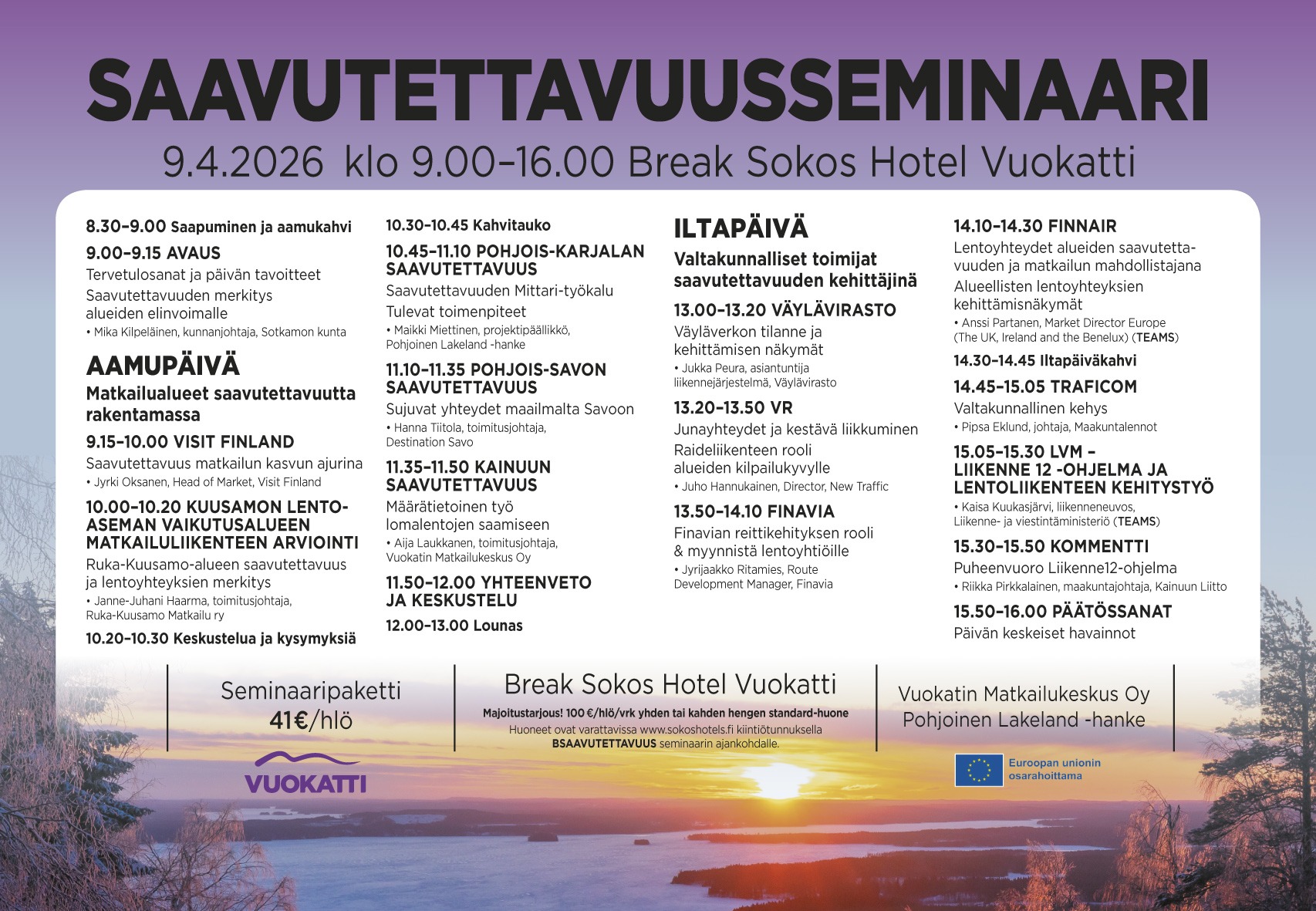 Kokouspaketti 41 € sis. osallistuminen tapahtumaan, lounas ja kahvit. Majoittumismahdollisuus BSH Vuokatissa 100€/yö koodilla BSAAVUTETTAVUUS.